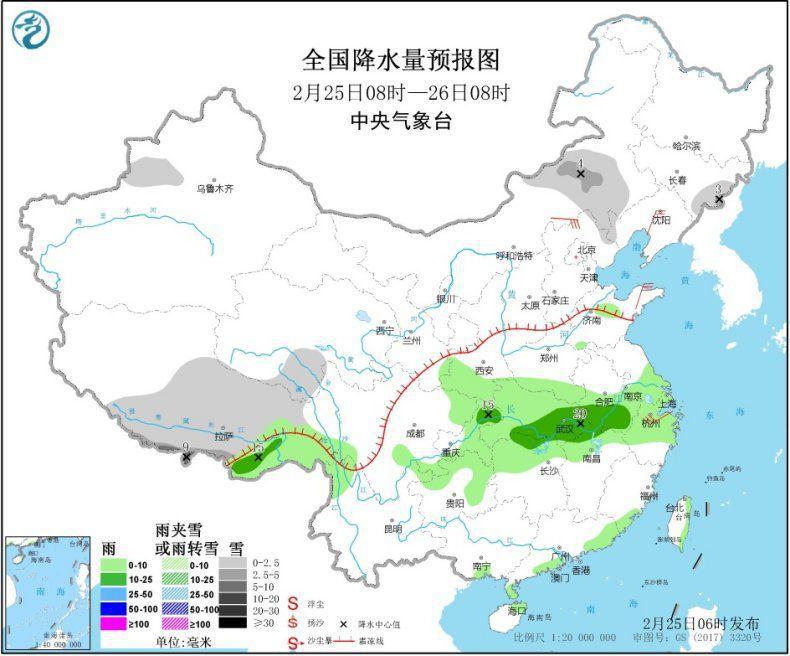 2月25日電 據(jù)中央氣象臺網(wǎng)站消息,26~28日,中東部地區(qū)將有大范圍雨雪過程,其中,西北地區(qū)東部、華北、東北、黃淮北部等地有雨轉雨夾雪或小到中雪,局地大雪。受低層切變線影響,25日至27日,黃淮南部、江漢、江淮、西南地區(qū)東部、江南北部等地將先后有小到中雨。
